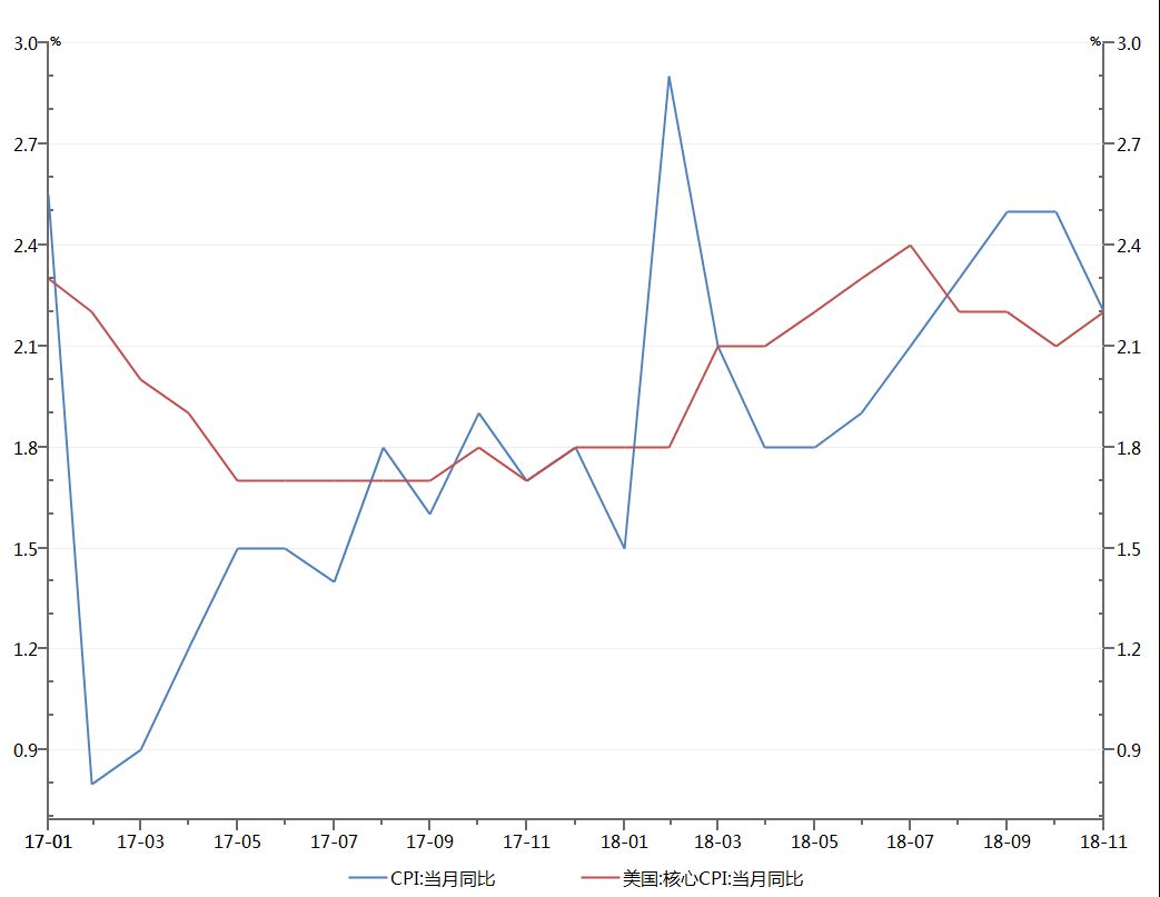 图:美国核心CPI和中国CPI同比走势