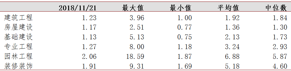 从历史估值水平来看,建筑工程行业静态PE10.36倍,距离最低值7.67倍还有25%的空间,PB1.23倍,最小值为1.00倍。子行业中装饰装修估值最接近底部目前PE16.64倍,最小值为15.22倍,PB1.91倍,最小值1.69倍。