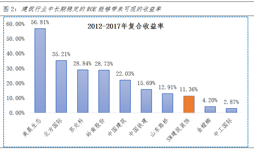 建筑行业作为中游行业,因为下游涉及领域较广,所以子行业众多,如果公司能够长期维持稳定的高ROE水平,随着时间的推移,都将成为行业的龙头企业。从各行业龙头的收益表现去看,中长期稳定的ROE能够带来可观的收益率。