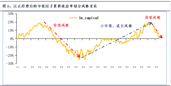 事实上,价值股一般具有大市值、低估值的特征,成长股一般具有小市值、高估值的特征,故以市值和估值两个核心维度来考察A股风格变化。