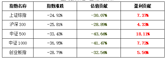 今年惨的原因在估值身上,客官们从下表可以看到,中证500、中证1000估值下杀了40%+,就连沪深300这类大盘价值的代表,估值也下杀了接近30%。但盈利端还是正贡献。
