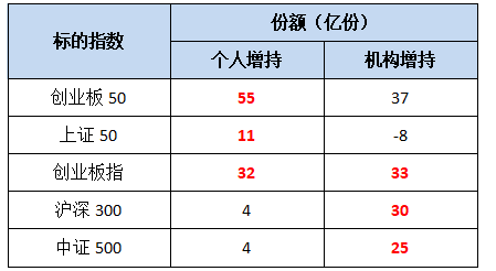 并且,机构和个人喜欢的ETF显然不太一样,个人投资者更喜欢创业板50、创业板指和上证50,机构投资者在沪深300、中证500、创业板指上,增持热情更高。