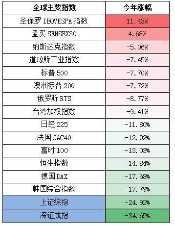 和全球主要市场指数比,上综指、深成指都跌得最多,其中,深成指为最。