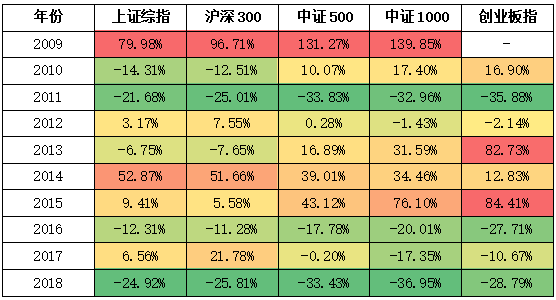 级掌柜统计了包括上证综指、沪深300、中证500、中证1000、创业板指在内的主要指数这十年来每年的涨幅,今年上证综指、沪深300、中证1000都是这十年里,跌幅最高的,剩下的中证500、创业板指跌幅倒数第二。