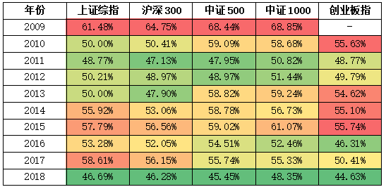 再换个角度,统计这十年来、这几个指数上涨的天数,在这个维度上,上证综指、沪深300、中证500、中证1000、创业板指统统最惨。平均的上涨天数占比(上涨天数/总交易天数)只有46%。