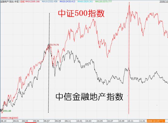 然后大盘蓝筹掉头向下,中证500指数继续蜿蜒向上(彼时还没有创业板指数),直到2010年11月。而蓝筹股并没有因为中小股票的拐点出现就返身向上。