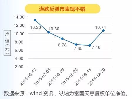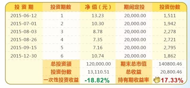 2015年6月至2015年12月底,富国天惠净值走势为连跌反弹,同样的,6期等额定投后,持有期收益率为17.33%,而一次性投资收益为-18.82%。定投收益略次于震荡走势定投,但表现依旧不错。因为连跌的时候能购买到更多份额,一旦反弹收益明显。