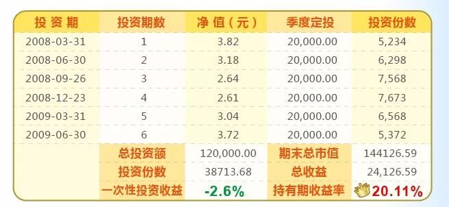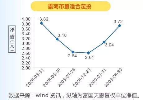 2008年3月底-2009年6月底,富国天惠的净值走势为“微笑曲线”(即“震荡区间”,图形见下图),走势为区间震荡回升,6期等额定投结束后,持有期收益率高达20.11%,远高于一次性投资收益-2.6%,定投收益位列3种行情下最高。