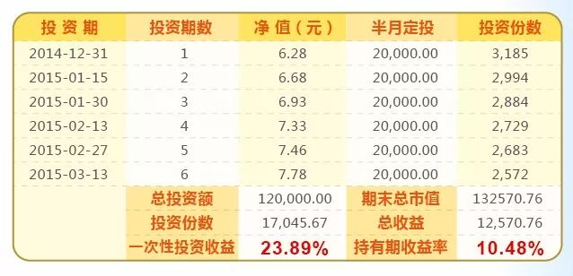 统计时间内,富国天惠净值走势为单边上涨,6期等额定投后,持有期收益率为10.48%,远低于直接买入的收益23.89%。