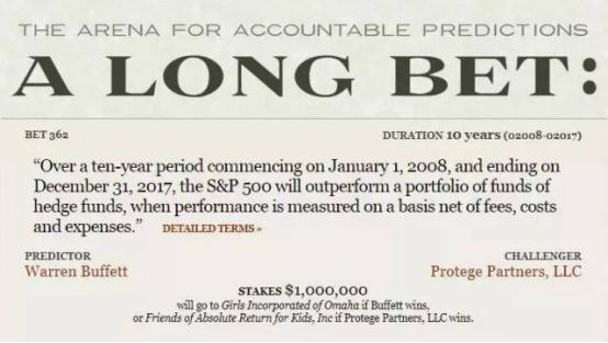 2007年,巴菲特以50万美金为赌注,对冲基金的基金经理选择任何基金组合,十年的收益都不会超过标普 500 指数基金的收益。2008年,Protégé Partners资产管理公司应战,选择了五种对冲基金组合与巴菲特的标普500指数基金对赌。