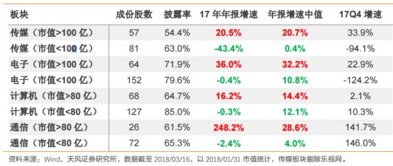 根据目前已经披露的17年年报数据,天风证券认为:传媒和计算机业绩有边际改善的迹象,大市值比小市值整体业绩更好。