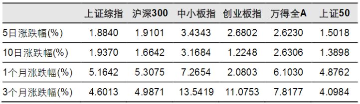 数据显示,中小板和Wind全A一直保持为正,而创业板指在经历了短期的负收益后,在3个月的时候转负为正,且涨幅超越了除中小板以外的其他指数。