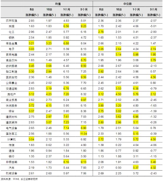 2. 行业普遍获得正收益。以申万28个一级行业为划分标准,各行业各区间涨跌幅、中位数如下: