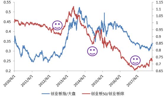 ● 对比上述提到的创业板行情起始时期(笑脸位置),我们可发现,对应的均是创业板业绩初现改善时;