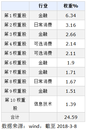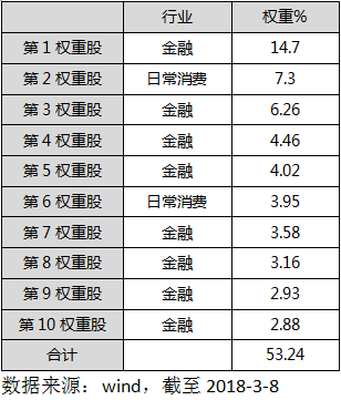 上证50是一个极不均匀的指数,目前其中有62%的股票是金融股,前十大权重股的权重之和有53.24%之多,所以这是一个极度依赖银行板块的指数。