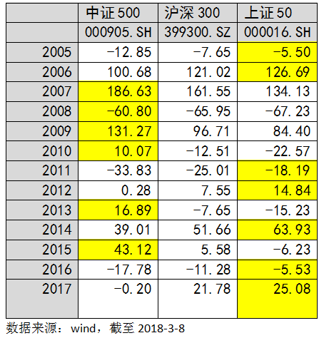 13年来,中证500优胜6次,而上证50优胜7次,平分秋色吧。