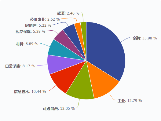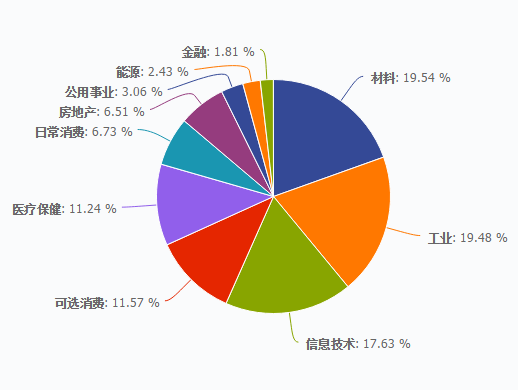 中证500的行业分布相对就均匀多了,且成长股较多,前三大权重行业分别是材料、工业和信息技术,所以这张饼图五彩斑斓而且色块匀称,看起来非常舒服。