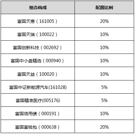 目前地缘政治和贸易壁垒频发对市场风险偏好形成打击和扰动,市场短期内仍以弱势震荡行情为主的可能性较大。我们弱化择时,坚持“高景气度、高风险收益比”的配置原则,力求在不放大风险的情况下获取确定性较高的绝对收益。目前最新推荐组合为“20%天惠+10%天益+10%天瑞+10%创新科技+10%富国中小盘精选+5%富国中证新能源汽车+5%富国精准医疗+10%富国信用债+20%富国富钱包”。