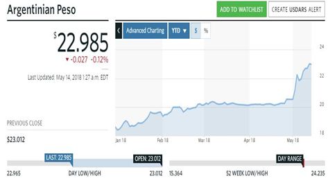 为了阻止该国货币继续崩溃,阿根廷央行在上周五(11日)再度花费10亿美元购买比索,但比索汇率依然下跌,并收创纪录新低。截至当天收盘,美元兑阿根廷比索汇率报报23.00978。今年4月,阿根廷比索也是全球主要经济体中表现最差的货币,紧随其后的是土耳其里拉和俄罗斯卢布。