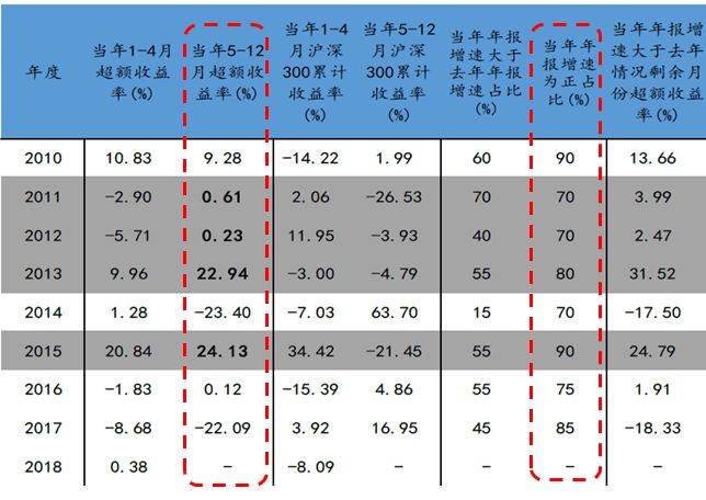 结果表明,除2014年和2017年以外,该策略在5月-12月均取得了正的超额收益。而2014年和2017年,是沪深300大幅走强的两年,用其做业绩基准,可能有失偏颇。