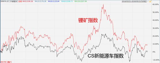 “锂矿指数”是wind里集合18只A股主流“锂”上市公司的一只指数,肉眼都可以看到CS新能源车指数与锂矿指数的关联度非常大,连细节都极其相似,只是部分时候波动较小而已。