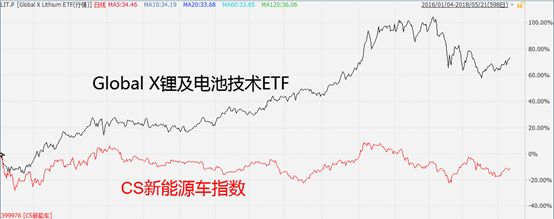 现在可以发现了,这两只形态是如此相近,只是国产货比外国货收益差较多,因为Global X Lithium在近两年半的时间里上涨了80%。