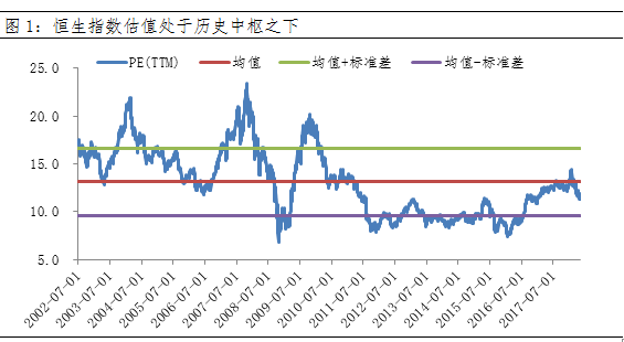 港股机构投资者占比高,市场情绪相对理性,估值始终较为合理。2002年下半年以来,恒生指数最高PE为23.44倍,最低PE仅6.80倍。上市公司业绩稳定增长,是港股长牛的基础。尽管2017年恒生指数大涨35.99%,但目前PE仍只有11.76倍,尚处于历史中枢之下。在全球流动性泛滥的大潮中,港股未出现明显泡沫。