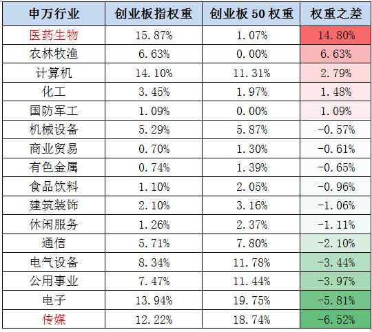 据统计,医药是创业板指的第一大权重股,权重占比高达15.87%,而其在创业板50中的权重仅为1%,两者权重之差高达14.8%!