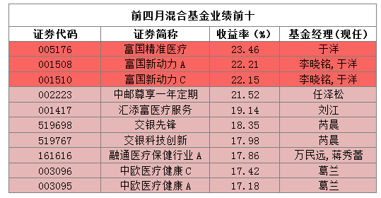 海通证券基金研究中心数据显示,富国精准医疗(005176)业绩遥遥领先,今年前4个月收益率23.46%,位列2821只基金中第一位。而富国新动力A(001508)、富国新动力C(001510),以22.21%、22.15%的收益率分列在第2位、第3位。
