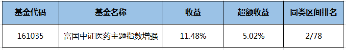客官们可以关注超额收益很高的富国中证医药主题指数增强(161035),不仅可获取医药板块带来的高beta收益,还能获得稳定的超额收益。