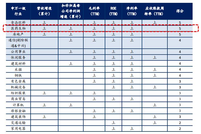 当然,仅纵向对比显示不出优势,申万宏源策略利用扣非后的净利润增速、营收增速、毛利率、ROE、净利率和应收账款周转率变化,对28个申万一级行业的今年一季度表现进行打分,并参考了今年二季度中小板业绩预告情况,纵向对比结果如下: