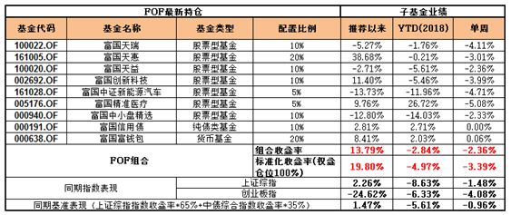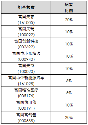 目前最新推荐组合为“20%天惠+10%天益+10%天瑞+10%创新科技+10%富国中小盘精选+5%富国中证新能源汽车+5%富国精准医疗+10%富国信用债+20%富国富钱包”。