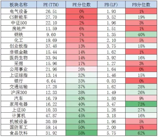 (备注:除CS新能车、创业板指之外,其余指数的估值分位数计算区间为2005.1.1-2018.6.19,CS新能车的估值分位数计算区间为2014.8至今,创业板指估值分位数计算区间为2010.6至今)