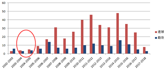 第一个低潮期是C罗刚到曼联的时候,发挥不是特别好,一度被认为是要陨落的新星,具体情况从大数据中可见一斑。
