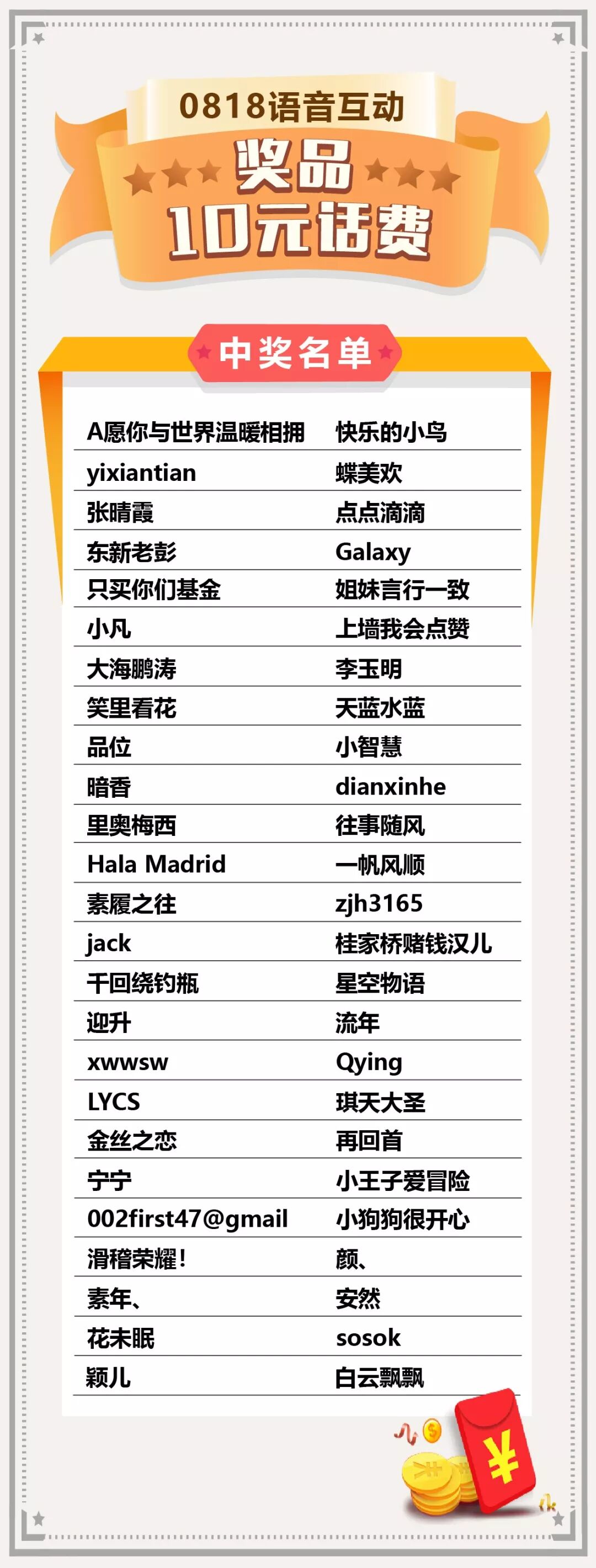 中奖话费将于8月24日(本周五)充值到中奖客官后台预留的手机账户中,请各位客官耐心等待~