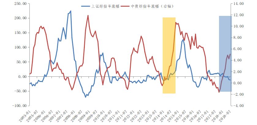 短期之内,风险偏好的变化、以及其他引发利率水平直接变化的因素,也可能引发股债两个市场的反应。直接来看,当利率上行成为市场的核心因素时,如2013年,股债双杀就会出现;当利率下行成为市场核心变量时,如2014年下半年到2015年上半年,股债双牛则会同步而来。今年以来,在中美贸易摩擦、经济去杠杆的背景下,投资者风险偏好迅速下降,股市持续低迷,尽管有违约担忧,但资金涌入低风险的债市避险。
