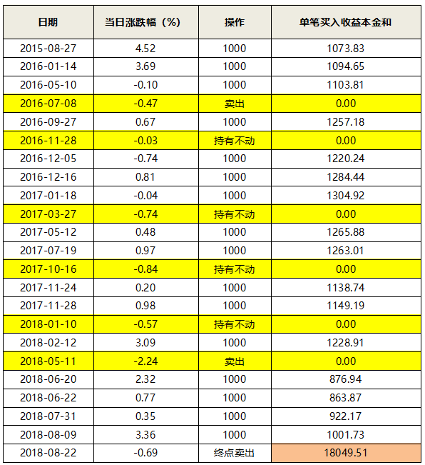 结果让富二大吃一惊,三年内一共发出16次买入信号,本金共计16000元,期间内赎回两次,到8月22日时,居然获取了2049.51元的收益,收益率达12.81%!