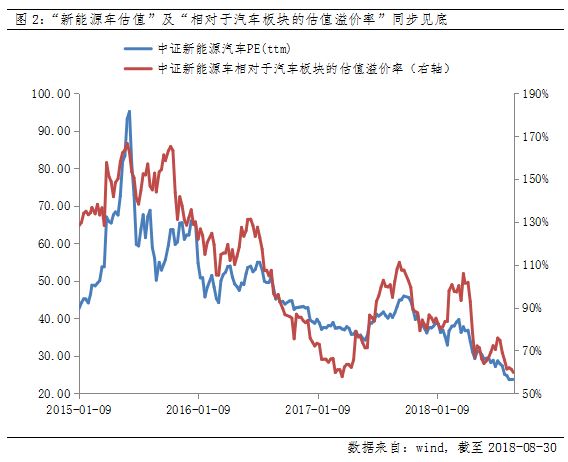据wind数据统计,中证新能源汽车相对与A股整个汽车板块的平均估值溢价在105%,目前的估值溢价率降至不到60%;绝对估值水平,2015年以来中证新能源车的平均市盈率为46倍,目前23倍,降至历史最低水平。
