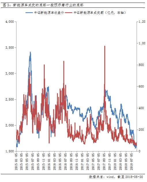目前,新能源汽车板块整体处于绝对估值底部、相对汽车板块的整体溢价率底部、以及成交量和换手率的底部。