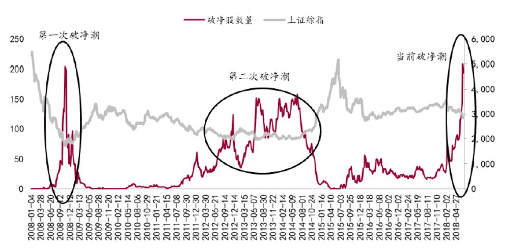 ❖ 第一次“破净潮”:2008年8月-2008年12月,当时随着金融危机席卷A股,大盘指数跌破1900点,破净个股绝对数量突破200只;