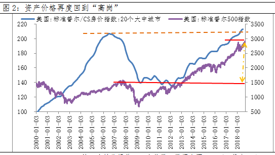 十年轮回后,房地产价格再度回到2006年的高点之上,截止2018年6月30日房地产价格指数为213.07(以2000年1月1日为100);股票市场更是从2009年开启了美股历史上最长的牛市,标普500自2009年底676.53点上升至2888.92点,涨幅超过4倍。同时,估值角度而言,目前标普500、道琼斯工业PE(TTM)分别为23.41倍,23.19倍,已处在历史的较高位置。资产价格逐渐站上“高岗”,轮回的种子似乎正在“蠢蠢欲动”。