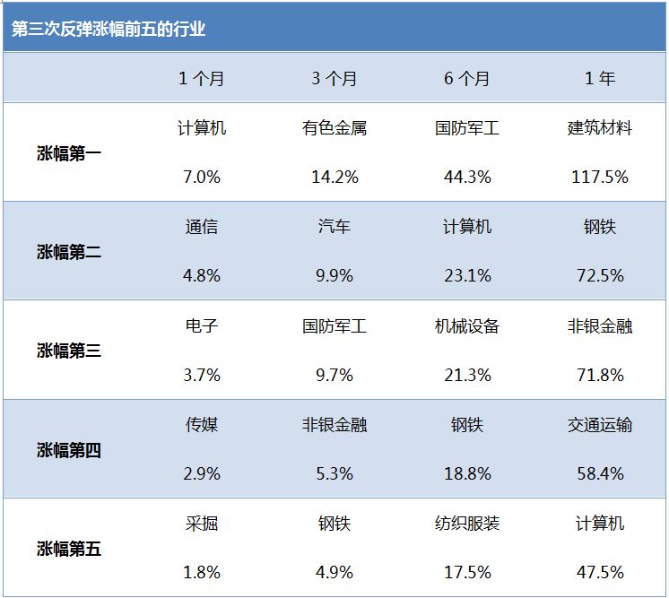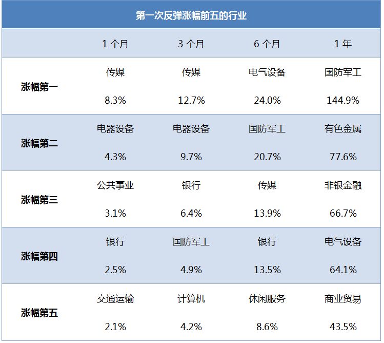 2005年6月,沪指砸出了最为经典的998.23点历史低位,而后便开始了一波A股历史上最大级别的上涨行情。这一波反弹主要是在股权分置改革、QFII开通和人民币升值的影响下形成的。从行业上来看,传媒、银行和电气设备在反弹前期表现较好,涨幅均位于前五;至反弹后期,国防军工板块强势崛起。