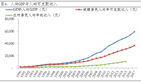 再者,对比人均GDP和人均可支配收入可以看出,不论是城镇还是农村,居民的可支配收入与同期GDP的“裂口”越来越大,这也就是说,我国居民收入“跑不过”GDP增长。与此同时,“教育、养老、医疗和住房”这“四座大山”也在制约着居民的消费能力。