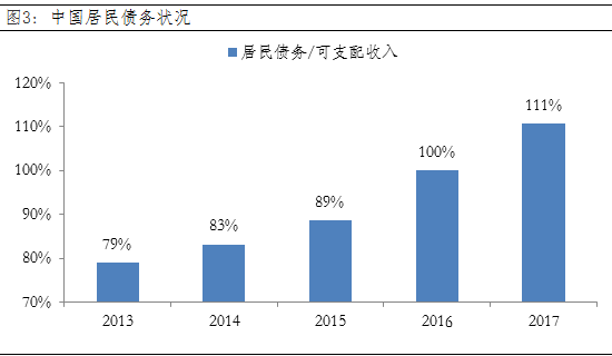 近年来全国消费品零售总额同比增速一路下滑,与此同时,居民的杠杆率不断提升。虽然从全球水平来看,中国的居民杠杆率水平并不高,但增速水平却令人咋舌。根据BIS的数据,美国居民杠杆率从20%到50%用了30多年,而中国只花了10年。另外,中国2017年居民债务占可支配收入的比重已高达111%,可谓“入不敷出”。