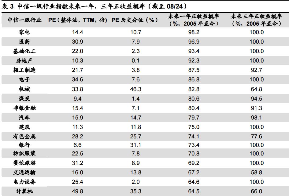 行业未来正收益的概率如下表。