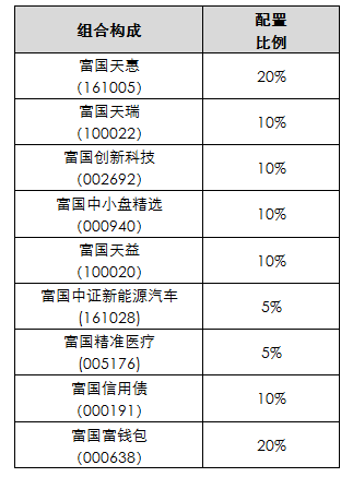 目前最新推荐组合为“20%天惠+10%天益+10%天瑞+10%创新科技+10%富国中小盘精选+5%富国中证新能源汽车+5%富国精准医疗+10%富国信用债+20%富国富钱包”。