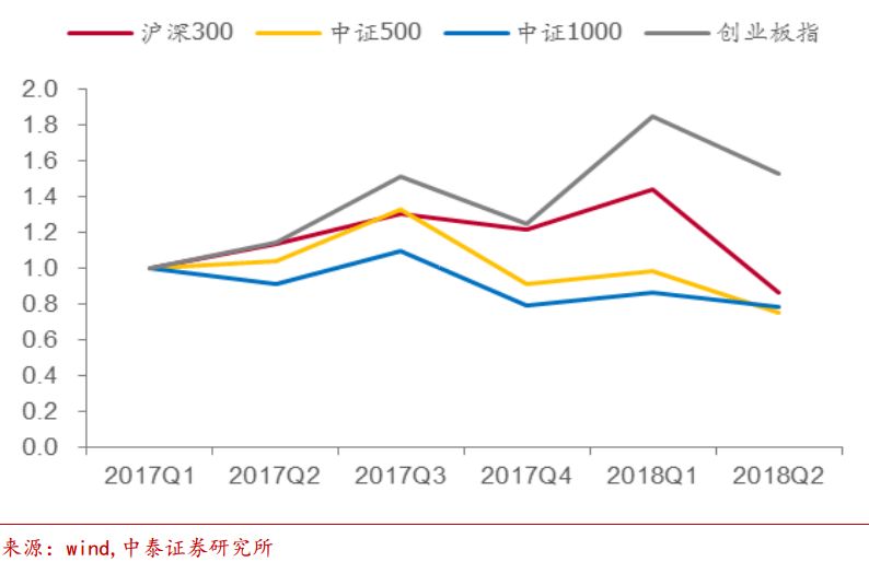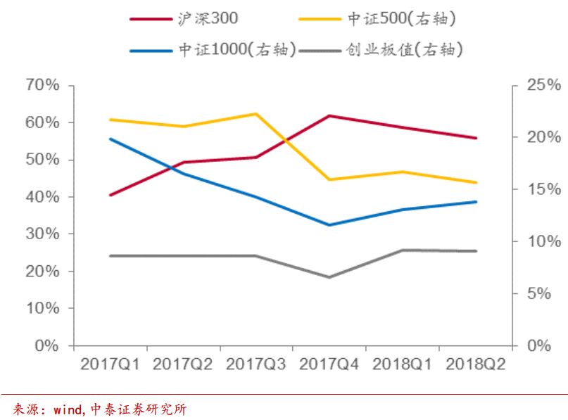 统计2017年以来、每个季度、股票型基金重仓股中,四大指数成分股的占比。对比沪深 300,中证 500占比较低。对比中证 1000 和创业版指,中证 500 占比持续下降。