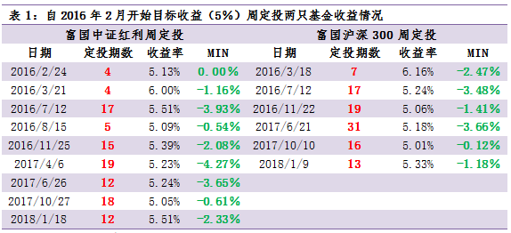 数据显示,如果自2016年2月1日起开始周定投,每达到5%的目标就赎回基金再开启下一轮定投,那么截止2018年9月,富国中证红利、富国沪深300基金分别实现9次和6次触发5%目标,平均实现5%目标需11.8周、17.2周,即平均一个季度内即可实现。除了投资者最关心的“赚钱”和赚钱所需要的时间长度外,投资者更关心的“亏钱”的概率和幅度,目标收益定投以“小胜”规避,且目标周定投富国中证红利、富国沪深300期间出现的最大回撤不超过5%。