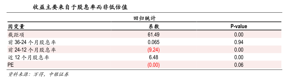 还有一点值得注意,在将筛选出来的“A股之犬”组合中个股收益率和其市盈率、股息率进行回归检测后发现,在四次历史底部时期,近12个月的股息率与最终收益率呈现出极为显著的正相关性,每当近12个月的股息率增加1%,其个股收益率就会同向增加6.48%。而反观市盈率,其则与最终收益率的呈现关联度不大。