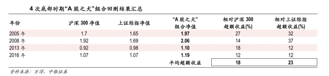 以A股市场上最为典型的四次底部时期作为回测时间,即2005年6月、2008年10月、2013年6月和2016年1月。我们在“道指之犬”的基础上进行了部分优化,除了结合近三年内的股息率进行筛选外,还辅以业绩增速、市盈率等业绩指标作为参考,以此筛选出盈利能力强、运营健康且价格被低估的优质上市公司,组成“A股之犬”组合